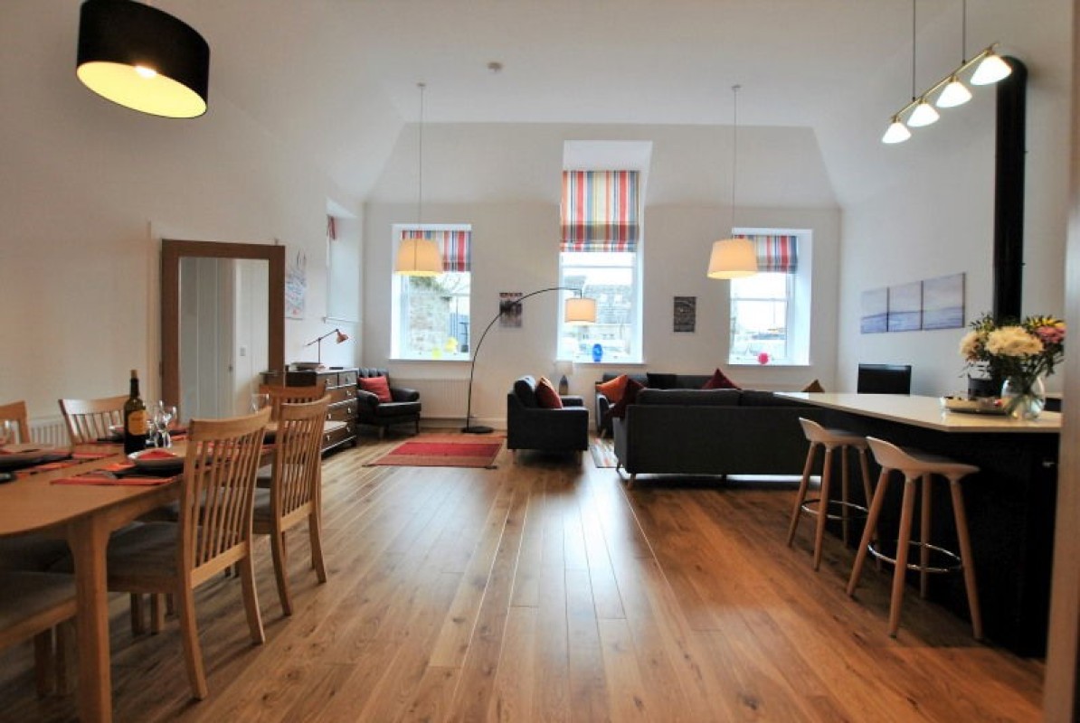 Sleeping up to four guests, both bedrooms benefit from having an en-suite shower room and there is an additional family bathroom. The focal point is undoubtedly the incredible living space which combines a fully fitted and well equipped kitchen with island for additional seating, dining area and lounge with wood burning stove. Gather together at the table to enjoy a meal, relax by the fire or take some time out with a book in the reading nook; whatever your preferred way to spend time, Academy Apartment offers plenty of space to socialise or to relax quietly.
