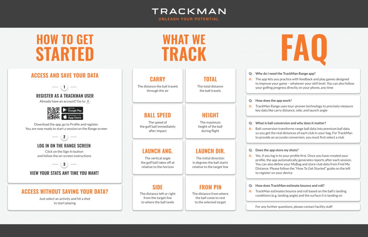 To get started, use the 27″ screen in your bay and follow the on-screen instructions. TrackMan Range precisely measures a series of key data points, such as your carry distance, side, and launch angle. Download the TrackMan Range App today in order for you save your shot data for later analysis. It’s a free app that allows you to practise with feedback and purpose. Follow your progression over time, directly on your phone/tablet or computer from anywhere you choose.