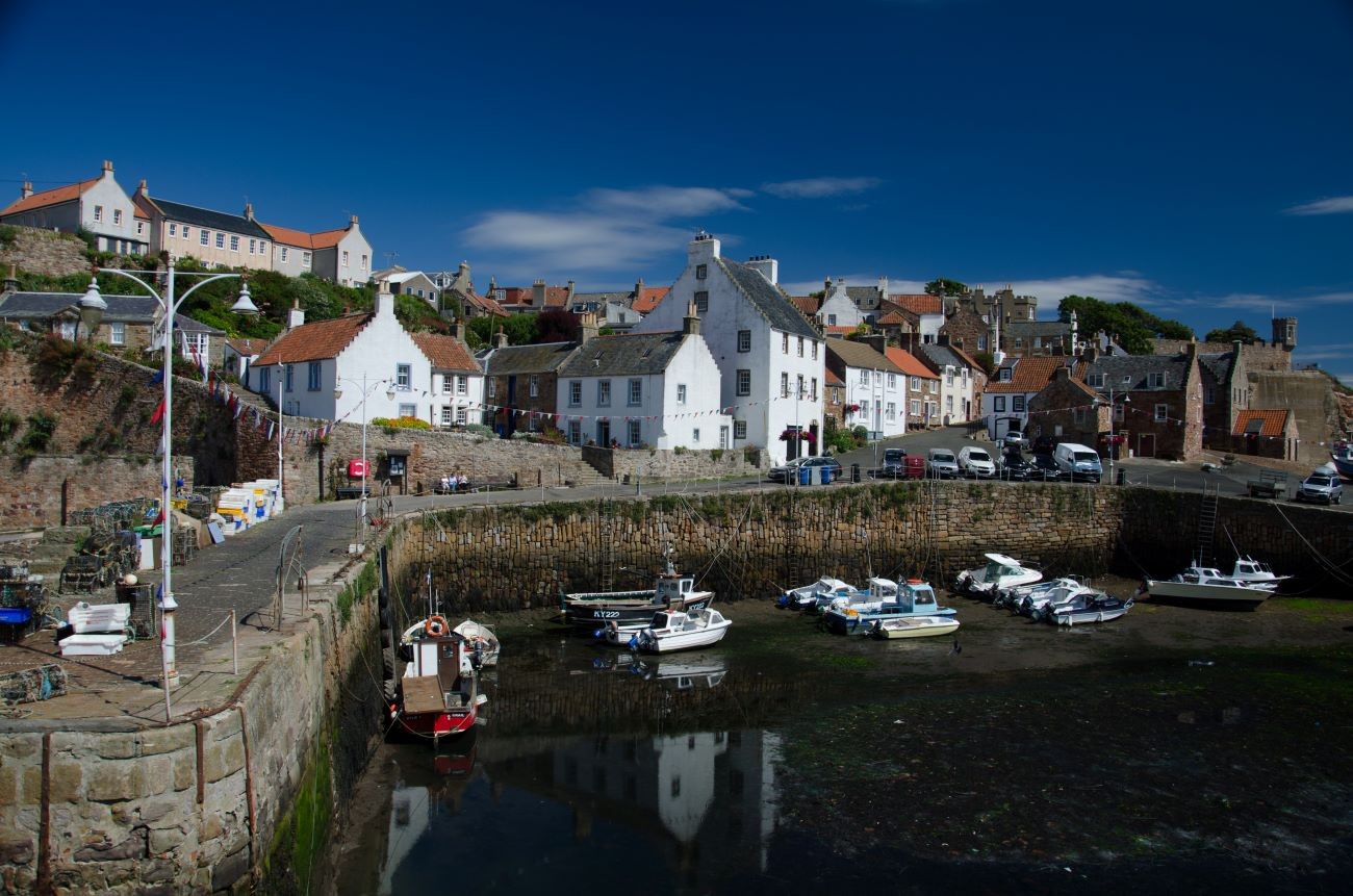 The harbour is reached by a steep, cobbled street, bordered by step-gabled houses once owned by fishermen and shipowners. Stop off at Crail Pottery or Crail Harbour Gallery & Tea Room, where the paintings battle for attention with the stunning sea views.