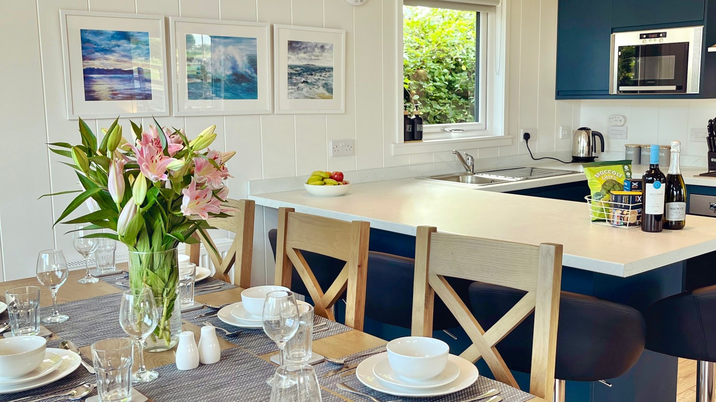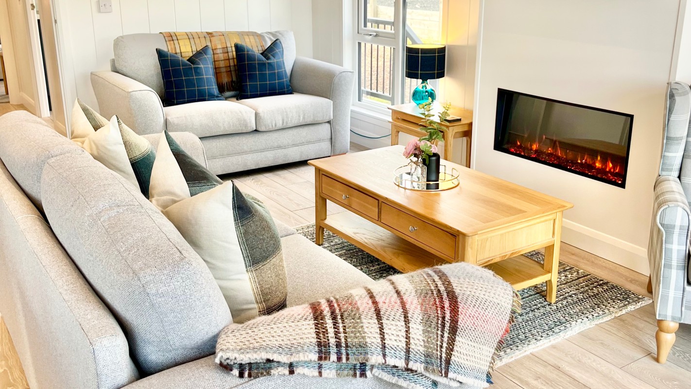 Boasting off-road parking for two cars, a tastefully-presented, open-plan living space, and a superb rural location close to a number of gold courses, this delightful stay welcomes a family of four or a group of friends, for a refreshing break in the picturesque Scottish countryside. Park up, and step up into your lovely new lodgings, where you will be greeted by a well-appointed living space, featuring a fully-equipped kitchen complete with all the appliances the chosen chef will need to rustle up a tasty, homecooked dinner. Savour your meals around the dining table with your loved ones, before you pour a glass of your favourite tipple to enjoy whilst you enjoy a film on the sleek, wall-mounted Smart TV in the sitting area, which is kept warm by a stylish, elegant electric fireplace.