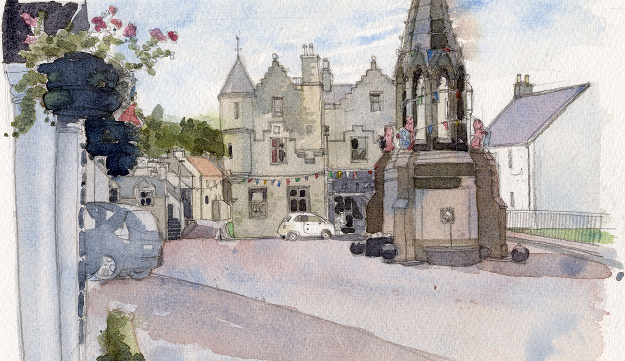You’ll recognise several locations in the village including the Covenanter Hotel which is Mrs Baird’s Guesthouse, the Bruce fountain where Jamie’s ghost looks up at Claire’s room, Fayre Earth Gift Shop which portrays Farrell’s Hardware and Furniture Store, Campbell’s Coffee House which appears under the same name in the show.