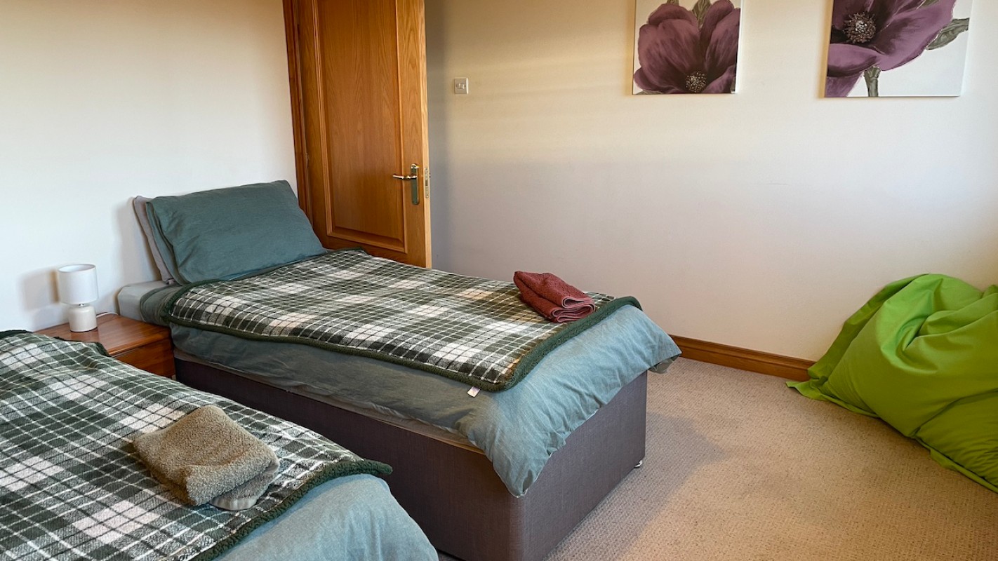 Inside, you’ll find an open-plan kitchen, dining, and lounge area for shared time together, a fully equipped kitchen for home cooking, a Smart TV for relaxing evenings, three bedrooms—a double, a twin, and a single—and a family bathroom with a corner bath and walk-in shower.