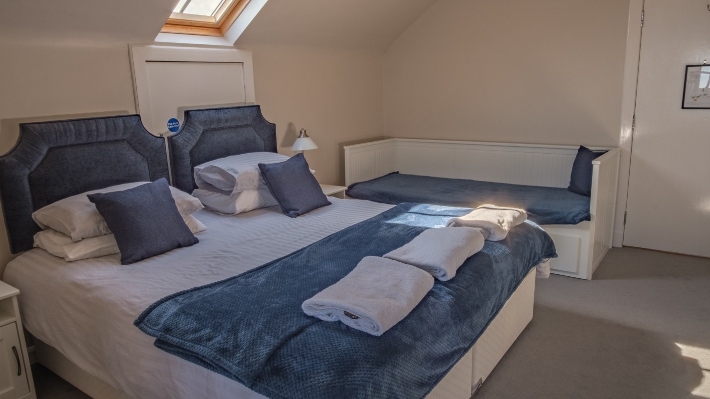 Up the stairs to the second floor there is a shower room with a WC and sink. The spacious bedroom has sea views, and features a superking bed which can also be made into two singles. There is also an additional single bed in the room.