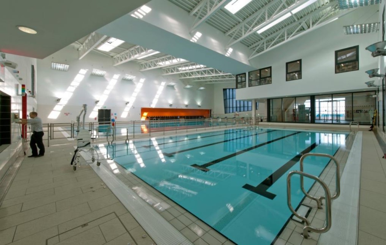 A modern leisure centre offering swimmng pools, gym, sports hall. fitness studio, sauna and steam room and a playcentre.