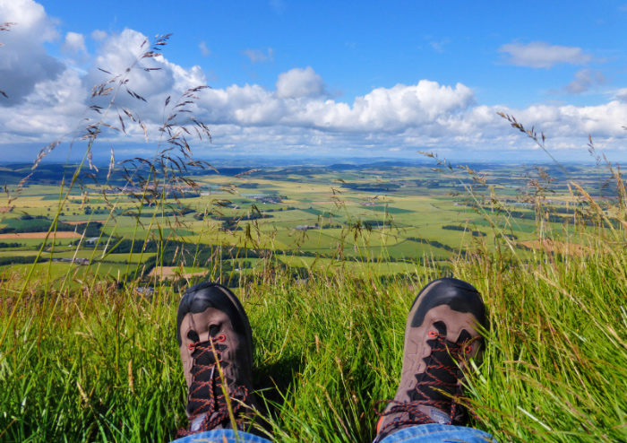 Immediately below you can see Falkland, some 350m lower down than you. On a clear day the views north stretch all the way to Braeriach and Lochnagar in the Cairngorms. To the east you can see Dundee and along the Angus coast towards Arbroath. To the south you can see the Firth of Forth, the Bass Rock, Edinburgh, all three Forth bridges and, if you’re lucky all the way to St Abbs Head just a stone’s throw from the English border. Looking west, back the way you came, you can see West Lomond, Schiehallion and much of Perthshire.